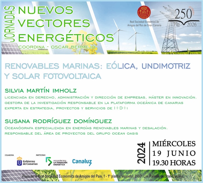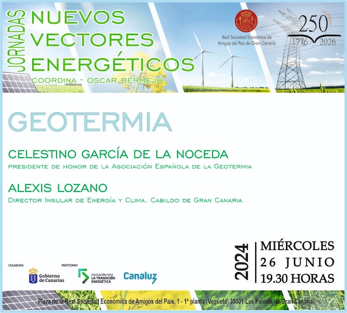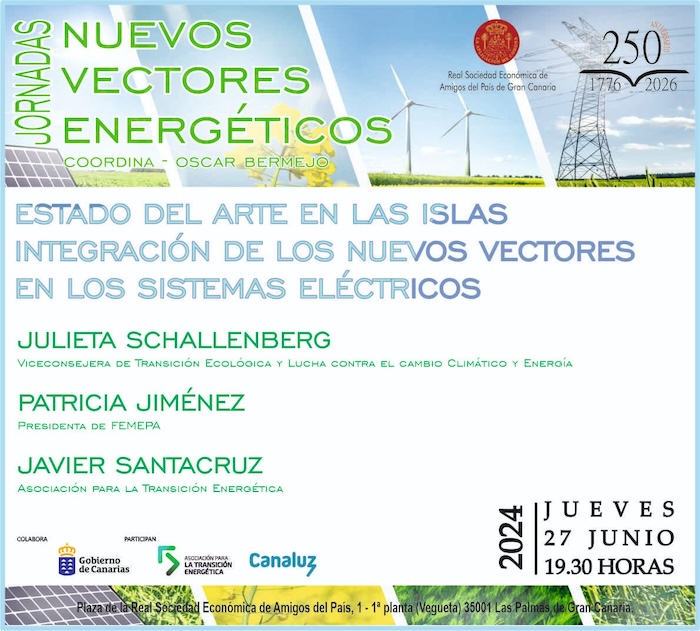 La Real Sociedad Económica de Amigos del País de Gran Canaria, en colaboración con la Asociación para la Transición Energética (ATE), el Gobierno de Canarias y Canaluz, ha organizado el ciclo de Jornadas Nuevos Vectores Energéticos, que se celebra a lo largo del mes de Junio de 2024, que a través de cuatro sesiones, tres sobre nuevos vectores, y una última sobre el estado del arte y la integración de los nuevos vectores en los sistemas eléctricos, abordará asuntos como la Geotermia, el Hidrógeno o las energías renovables.